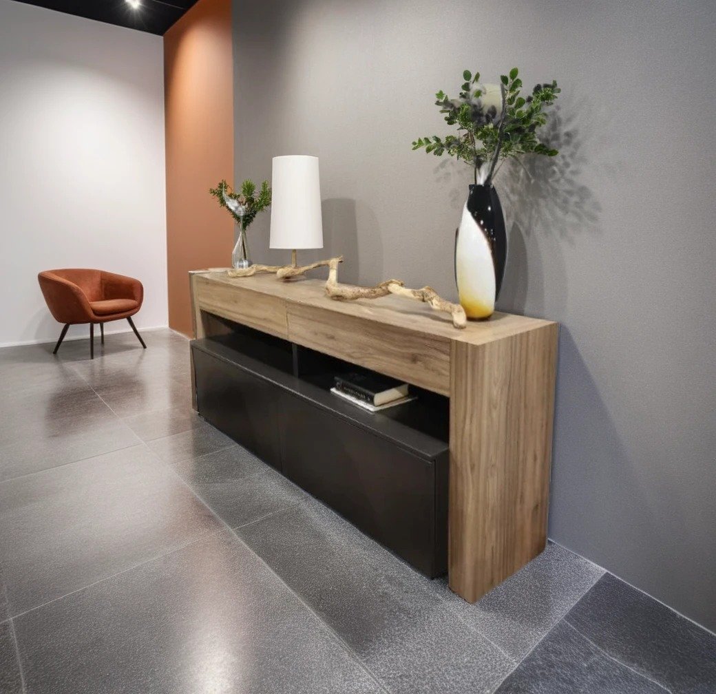 - Πέρα από την εντυπωσιακή του εμφάνιση, αυτός ο μπουφές προσφέρει έξυπνη αποθηκευτική λύση. Διαθέτει δύο ευρύχωρα πορτάκια με μηχανισμό μαγνητικού κλεισίματος για αθόρυβη και ασφαλή χρήση. Επιπλέον, κρύβει διακριτικά δύο εσωτερικά συρτάρια, ιδανικά για την οργάνωση μικροαντικειμένων και την διατήρηση ενός καθαρού και μινιμαλιστικού στυλ.