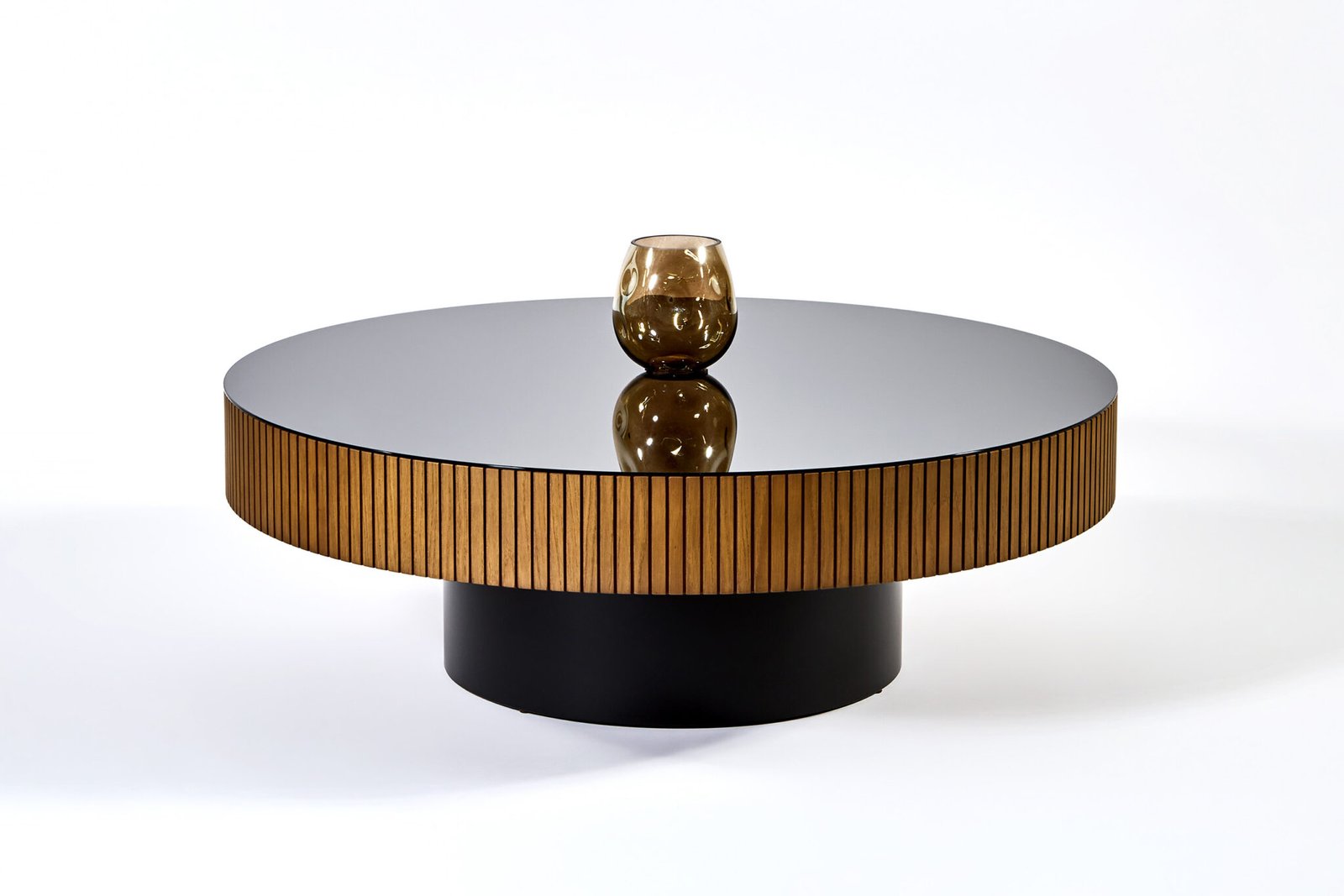 Η βάση του αποτελείται από δύο μέρη: το κάτω τμήμα είναι σε μαύρο ματ χρώμα, προσφέροντας μια στιβαρή και μινιμαλιστική εμφάνιση, ενώ το επάνω τμήμα ξεχωρίζει με την επένδυσή του από κάθετες ξύλινες ράβδους σε φυσική απόχρωση. Αυτός ο συνδυασμός του γυαλιού, του ξύλου και του μαύρου χρώματος δημιουργεί μια εντυπωσιακή αντίθεση που δίνει στο τραπέζι μια μοναδική προσωπικότητα και το καθιστά ιδανικό για ένα μοντέρνο και κομψό σαλόνι.