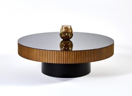 Αυτό το στρογγυλό τραπεζάκι σαλονιού αποτελεί ένα κομψό και σύγχρονο κομμάτι που συνδυάζει αρμονικά διαφορετικά υλικά και υφές. Η επιφάνειά του είναι κατασκευασμένη από γυαλί σε σκούρα απόχρωση, το οποίο δημιουργεί μια εκλεπτυσμένη, γυαλιστερή αντανάκλαση.