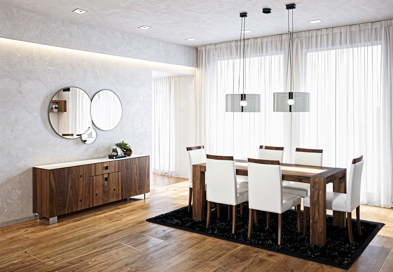 τραπεζαρία σαλονιού ανοιγόμενη απο την μία η και από τις δύο πλευρές. Όλη η επιφάνεια της είναι επενδυμένη με φυσικό καπλαμά (canaletto) από ξύλο καρυδιάς ή δρυς ή οξιάς με