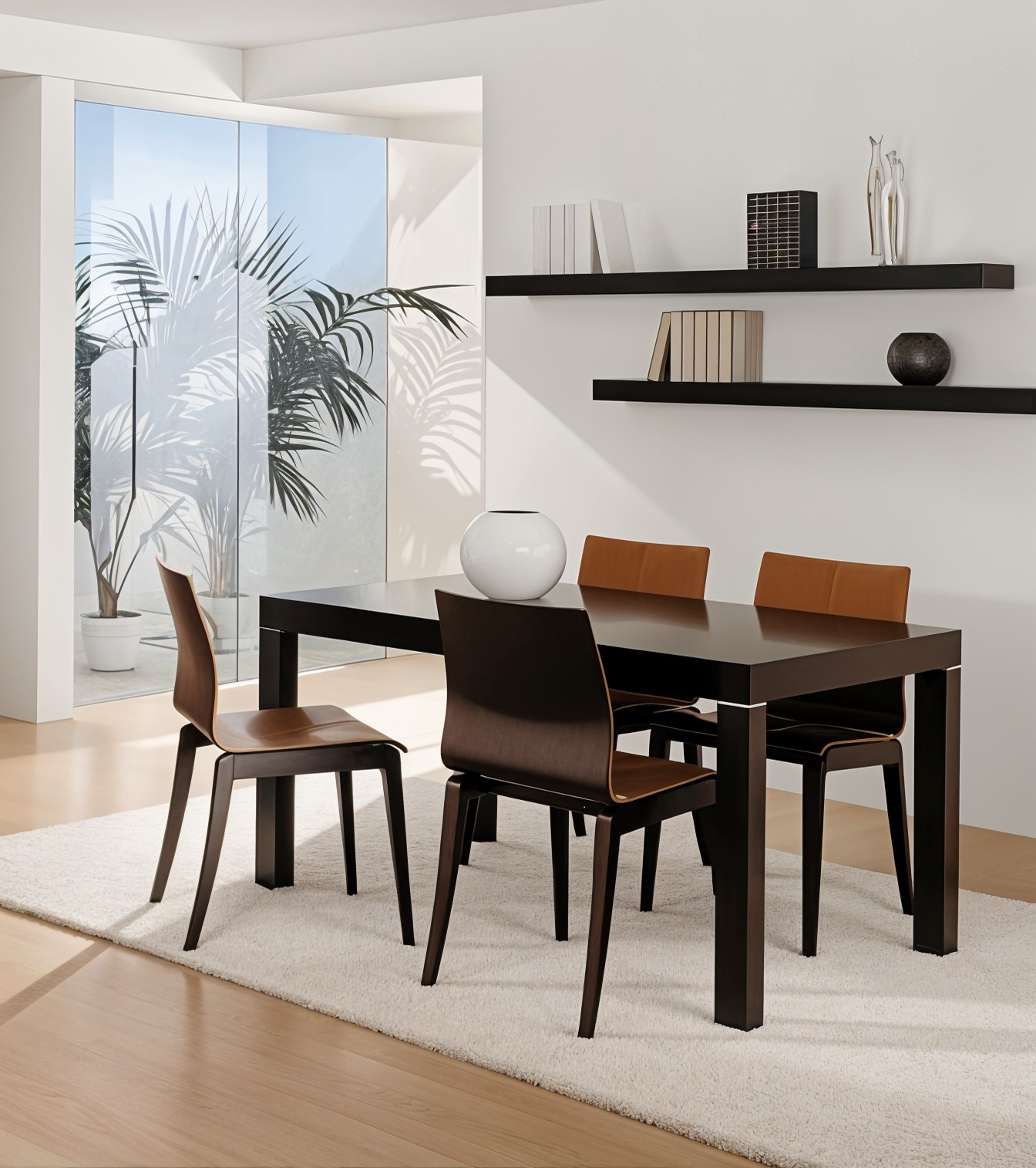 τραπεζαρία σαλονιού με καρέ γραμμή και διαχρονικό ύφος, ανοιγόμενη και από τις δύο πλευρές. Όλη η επιφάνεια της είναι επενδυμένη με φυσικό καπλαμά (canaletto) από ξύλο καρυδιάς ή δρυς ή οξιάς με