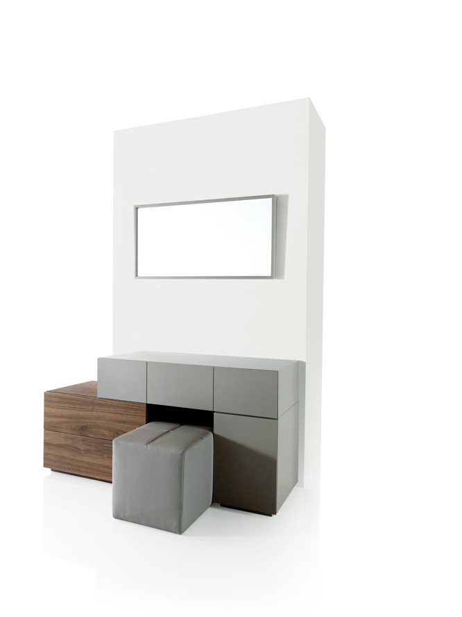 μοντέρνα κονσόλα με απλή, λιτή και απέριττή γραμμή, με όλη την επιφάνεια της επενδυμένη με φυσικό καπλαμά (canaletto) από ξύλο καρυδιάς ή δρυς. Η