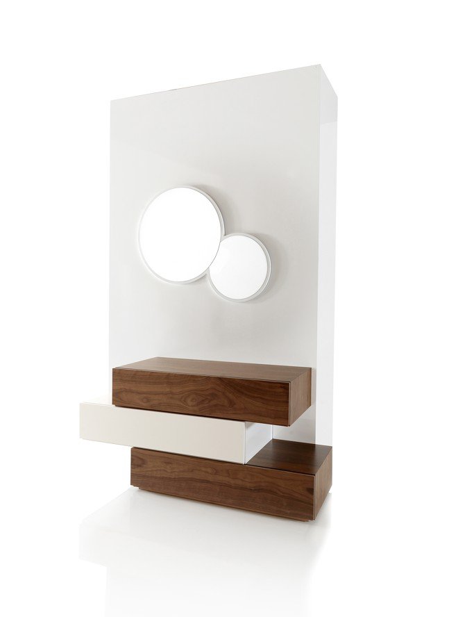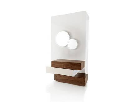 αποθηκευτικούς χώρους και διακοσμείται με ένα υπέροχο καθρέπτη που μπορεί να αντικατασταθεί από έναν μοντέρνο πίνακα. Οι τρεις αποθηκευτικοί χώροι έχουν τις ίδιες διαστάσεις και είναι στοιβαγμένοι κατακόρυφα με ελαφρές αποκλίσεις στην τοποθέτηση μεταξύ τους.