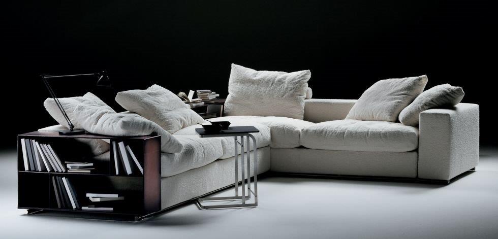 Μοντέρνος λιτός γωνιακός καναπές από μασίφ ξύλο (οξιά ή δρυς) με συμμετρικά μακρόστενα μαξιλάρια καθίσματος και με πολλά πλούσια μαξιλάρια πλάτης. Ιδιαίτερα αναπαυτικός και άνετος κατάλληλος για καθιστικά ή σαλόνια με μεγάλους χώρους.