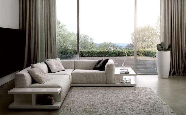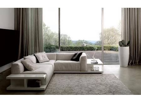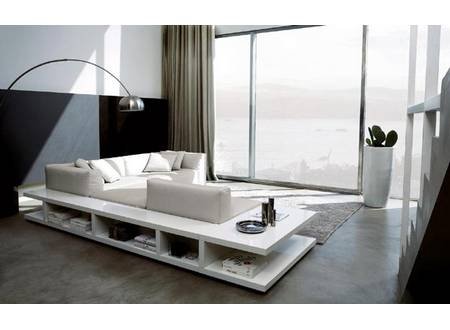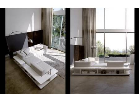 Μοντέρνος γωνιακός καναπές που διαθέτει ραφιέρα στο ένα μπράτσο, η οποία το κυκλώνει και εκτείνεται στην ευθεία της αντίστοιχης πίσω πλευράς του.