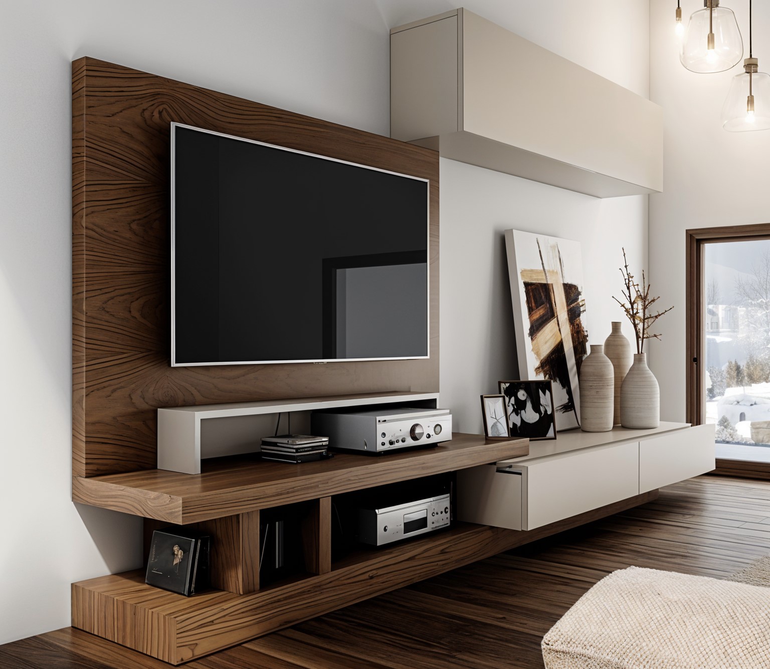 Επιτοίχια σύνθεση για το σαλόνι σας που αποτελείται από διαφορετικά κομμάτια και είναι κατασκευασμένη με ξύλο (δρυς ή καρυδιά). Χαμηλά στο πάτωμα τοποθετείται μια χαμηλή