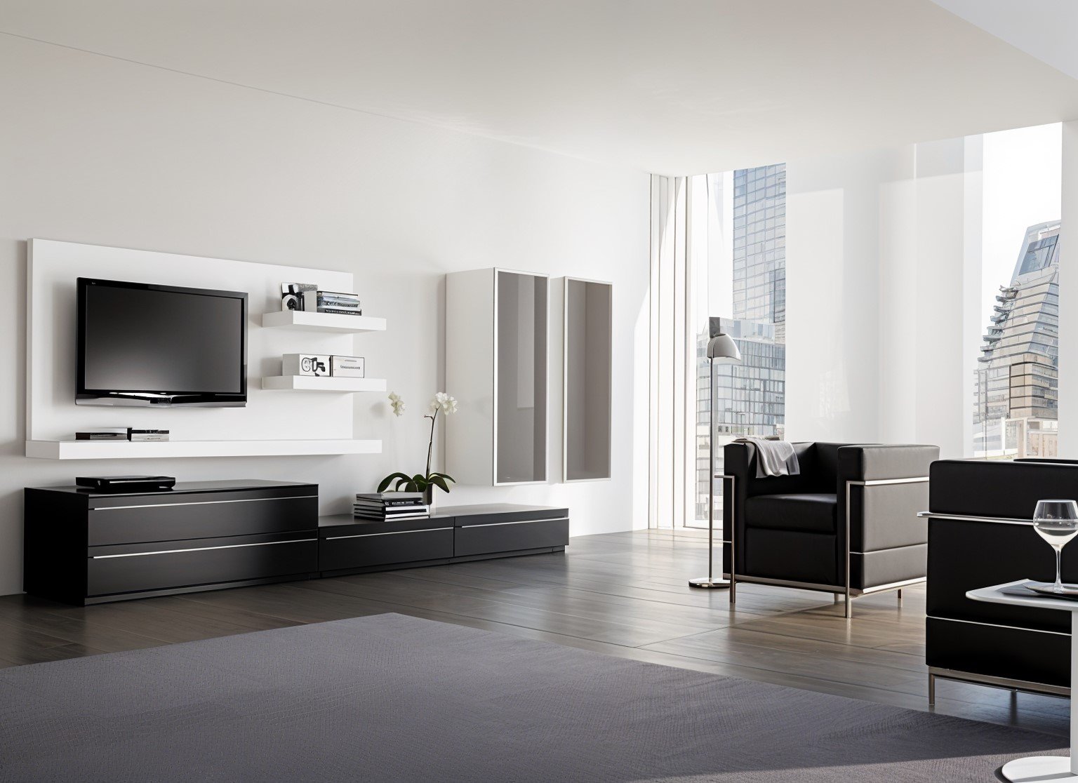 Από πάνω του τοποθετείται επιτοίχια ξύλινη πλάτη με ραφιέρα στο χαμηλότερο σημείο της. Πάνω στην ξύλινη πλάτη στερεώνεται η τηλεόραση (TV) σας και στο πλάι τοποθετούνται επιπλέον ράφια.
