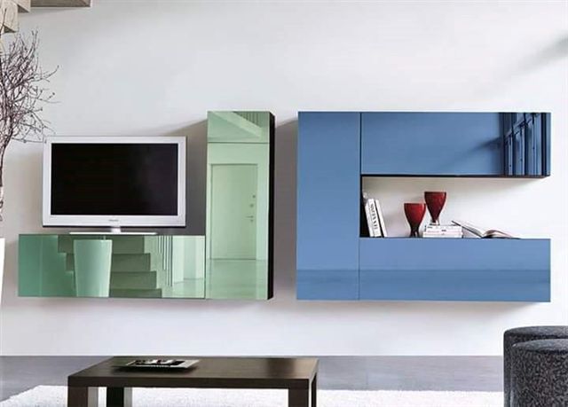 Μοντέρνα επιτοίχια επιπλοσύνθεση με κλειστούς αποθηκευτικούς χώρους (ντουλάπια). Η επιπλοσύνθεση είναι ελεύθερη και αποτελείται από δύο (2) κομμάτια: