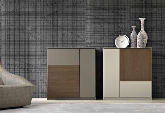 Μοντέρνοι ξύλινοι μπουφέδες Δίδυμοι με όλη την επιφάνειά τους επενδυμένη με φυσικό η οικολογικό καπλαμά (canaletto) από ξύλο δρυς-καρυδιά-καστανιά και πολλά άλλα. Η σχεδίαση του μπουφέ είναι αντισυμμετρική. Κάθε μπουφές έχει ανισομερή τμήματα, που χρησιμεύουν ως αποθηκευτικοί χώροι, ενώ παράλληλα η πρόσοψη είναι ένα τετράγωνο.