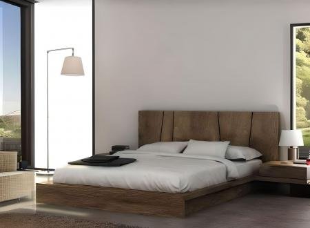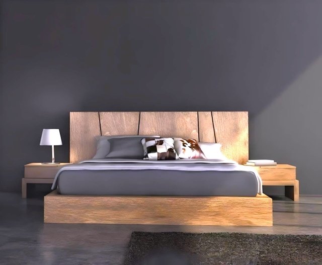 Το κρεβάτι διαθέτει βάση κατασκευασμένη από ξύλο και πλαισιώνεται από μεγάλη μονοκόμματη πλάτη (κεφαλάρι). Η πλάτη (κεφαλάρι) συνεχίζεται πέραν των ορίων του κρεβατιού και από τις δύο πλευρές (δεξιά αριστερά). Μποροστά από την πλάτη τοποθετούνται 2 κομοδίνα. Τα κομοδίνα έχουν από 1 συρτάρι το καθένα, όπου φαίνονται ανάγλυφα τα νερά του ξύλου. Δεν διατιθεται σιφονιέρα αλλά μπορεί να κατασκευαστεί εφόσον το επιθυμείτε.