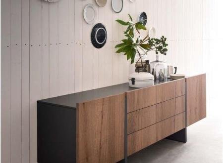 ξύλινος μπουφές με όλη την επιφάνεια του επενδυμένη με φυσικό καπλαμά (canaletto) από ξύλο δρυς (ή καρυδιά). Η