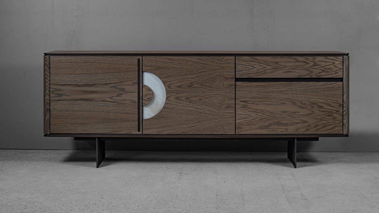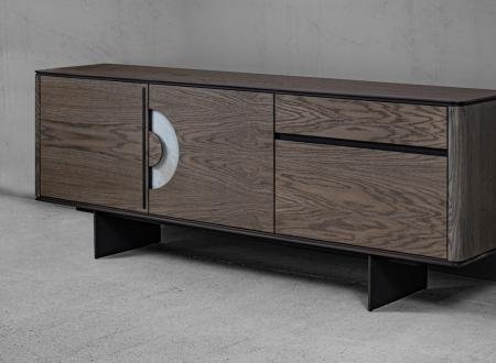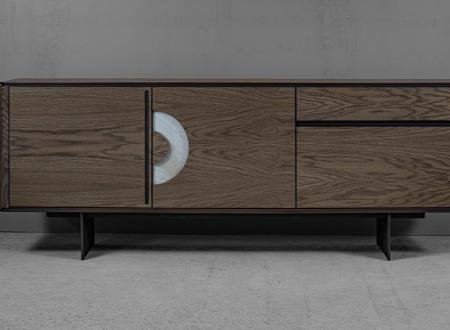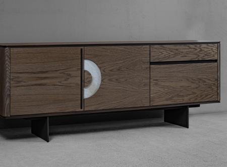 ξύλινος μπουφές από MDF με όλη την επιφάνεια του επενδυμένη με φυσικό καπλαμά (canaletto) από ξύλο καρυδιάς (ή δρυς), με λεπτομέρειες γυαλιστερής λάκας.