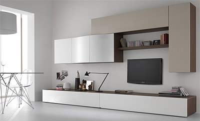 μοντέρνα επιτοίχια σύνθεση κατάλληλη για την φιλοξενία της τηλεόρασης σας. Αποτελείται από οριζόντια παραλληλόγραμμα ντουλάπια και κλειστούς αποθηκευτικούς χώρους. Χαρακτηριστικός είναι ο