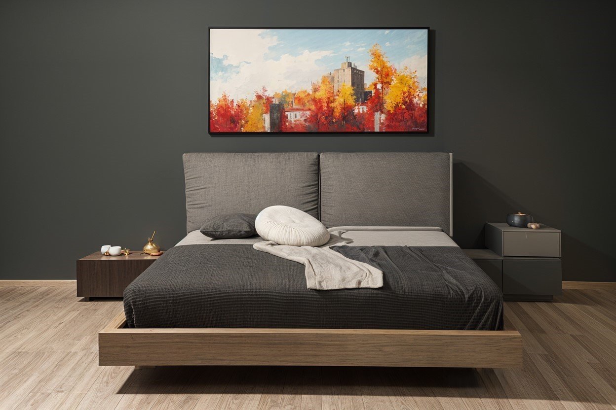Τα κομοδίνα, σε διαφορετικές αποχρώσεις, προσθέτουν πρακτικότητα και μοντέρνα αισθητική. Ο πίνακας πάνω από το κρεβάτι δίνει μια καλλιτεχνική νότα.